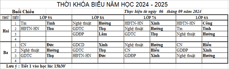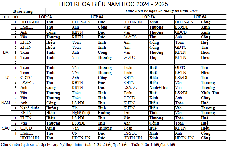 Thời khoá biểu THCS (áp dụng từ 6/9/2024)