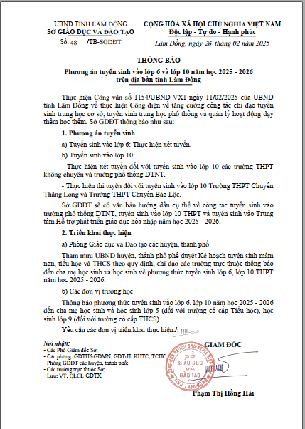 Thông báo phương án tuyển sinh vào lớp 6, lớp 10 năm học 2025 - 2026